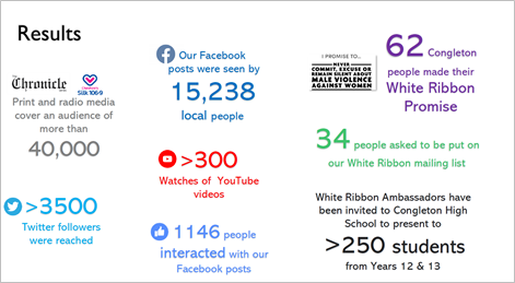 We sent the report to White Ribbon UK whose CEO sent Congleton TC a personal thank you message, telling us that the report will be used to help other more recently-accredited town and parish councils plan their White Ribbon activities.