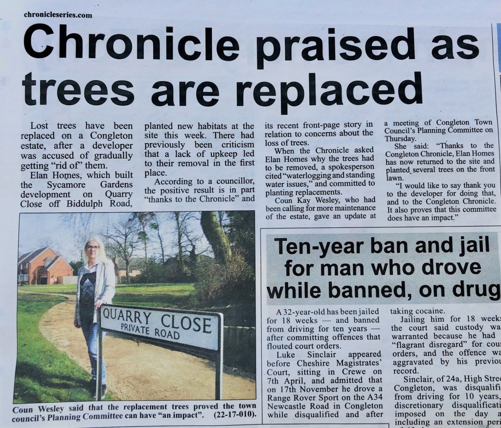 Local residents, including myself, have been concerned about the loss of a number of important and established trees at Quarry Close in Mossley. That site was a small wood before development started, and the majority of the trees have now gone. The developer, Elan Homes, was instructed by Planning Officers to replace some of the lost trees, but this had not happened. I raised this issue at our Planning meeting in March, and the Congleton Chronicle reported this on its front page. They interviewed Elan Homes who then returned to the site and planted some replacement trees.