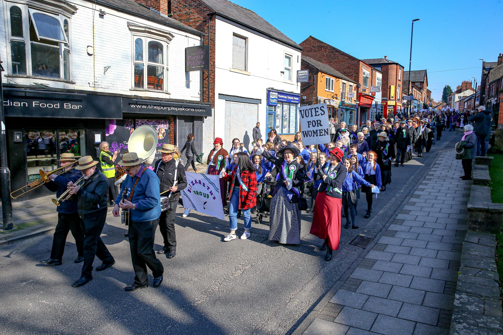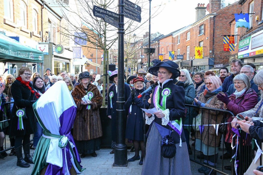 I worked with Jo Money of Congleton Community Projects to organise the parade part of the day, led by Beartown Stompers Jazz Band. Children dressed up from ten local primary/nursery schools, together with Women’s Institutes, the Guides and many more community groups paraded into the town centre and packed into the busy pedestrian area ahead of the unveiling. Congleton Choral Society and Daven & Mossley school choirs gave wonderful feminist-inspired performances. My colleagues on Elizabeth’s group organised a great set of Victorian stalls and games, including a Punch ‘n’ Judy show with a twist, as Punch learned his lesson and became a White Ribbon Ambassador!