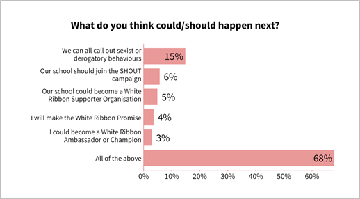 There was enthusiasm for continuing the work in school and 48 students made their White Ribbon promise there and then, going back to lessons wearing a white ribbon badge. Almost 70 per cent said ‘All of the above’ to a list of actions they could take, from calling out sexist behaviours to becoming a White Ribbon School.