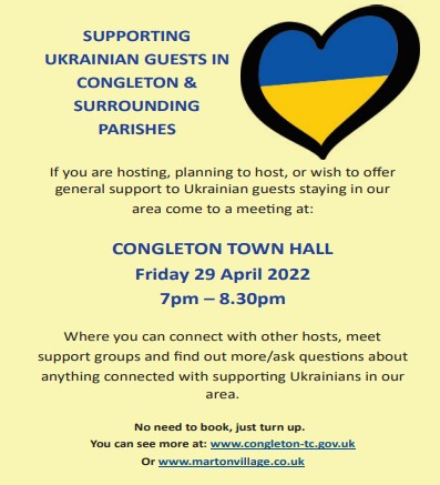 Thank you so much to all those who have worked tirelessly to help, including driving trucks to Poland and setting up support groups for people coming to stay in Congleton and the surrounding area. A group from Marton has shown considerable leadership in this area and Congleton Town Council is working closely together with them. Our first Ukrainian guests have arrived and we are holding a meeting for them and anyone interested in hosting on 29th April in the Town Hall. There are regular social get-togethers too, in the Plough at Eaton so far – let me know if you are a host family and want to get involved. Meanwhile my husband Mike and I are awaiting visas for our own guest family to be able to travel.