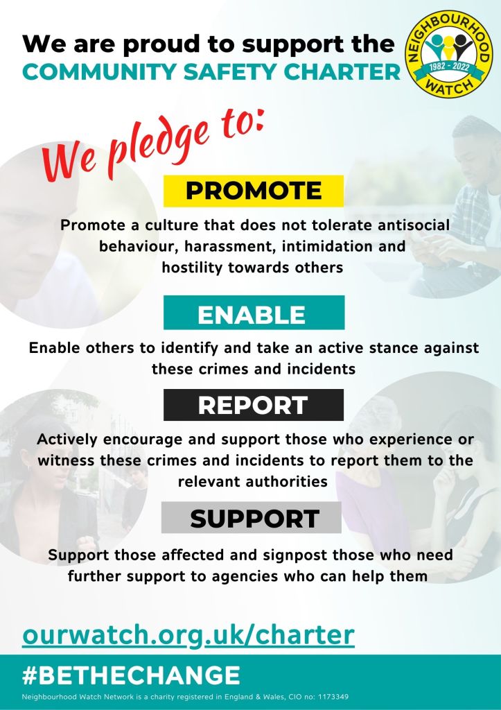 In my role as Chair of the ASB Working Group I attended a webinar on the Community Safety Charter, run by the Neighbourhood Watch Group. This is a charter that towns, organisations and individuals can sign up to in order to signal that antisocial behaviour, intimidation and hostility will not be tolerated.
