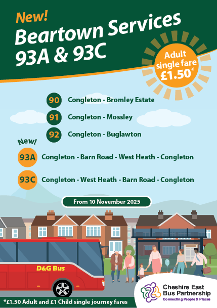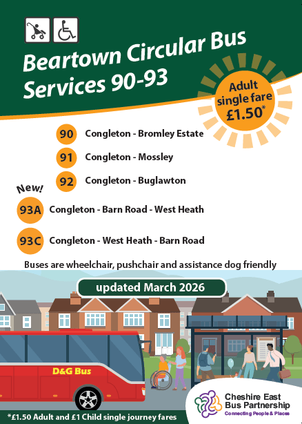 The new timetable is going into all homes in Congleton inside the Bear Necessities Newsletter. Look out for it – and why not try catching the bus?