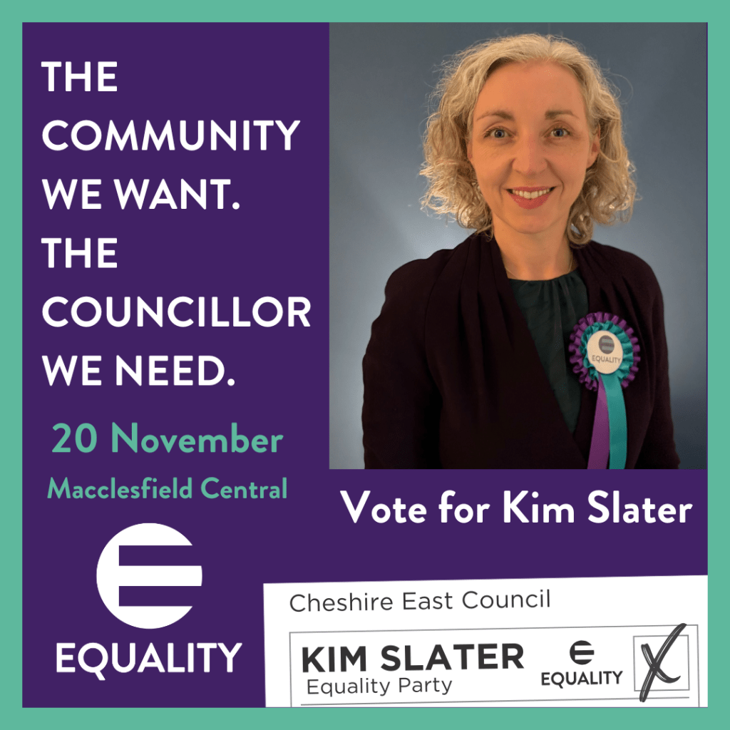 Kim Slater stood for the Equality Party in the Cheshire East by-election, Macclesfield Central Ward on 20th November, and got 2.5% of the vote, the first time the Equality Party has ever stood in Macclesfield. She beat the LibDem candidate. The election was won by the Greens, largely in our view because the party leader, Zack Polanski, is championing our policies in the media. Congratulations to John Knight who will be an excellent Councillor.
